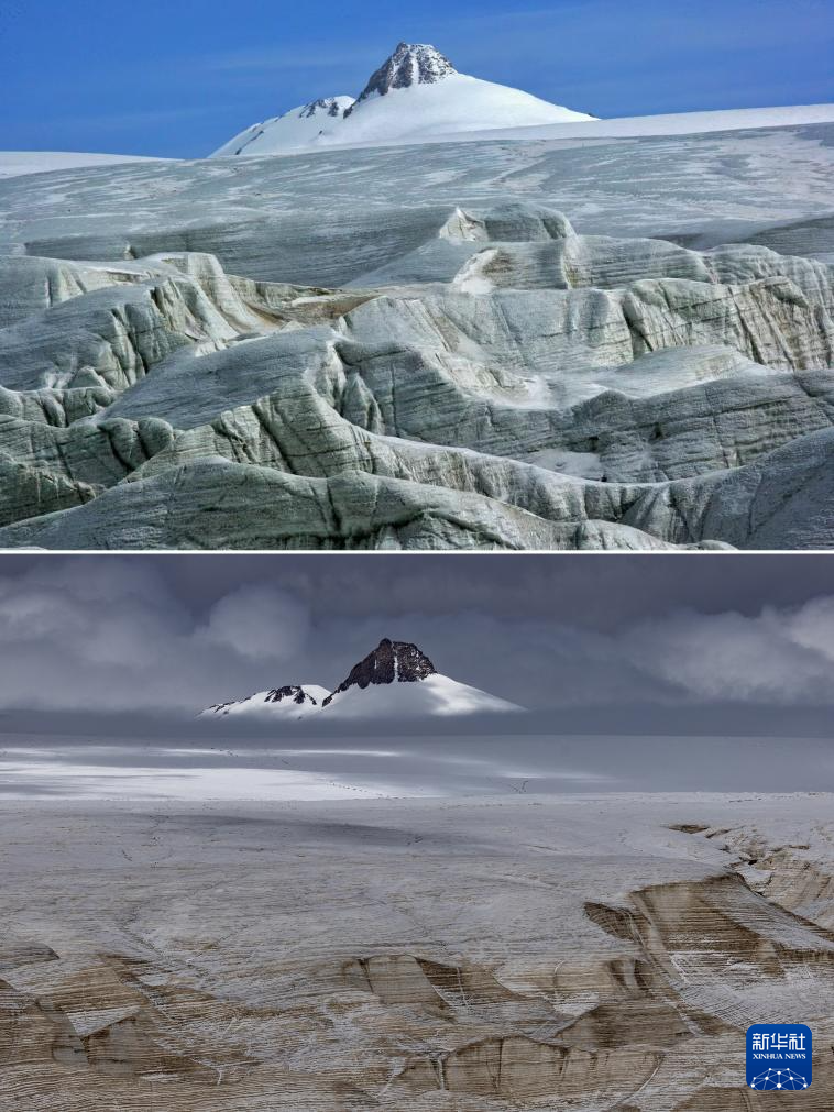 拼版照片:上圖為2009年6月拍攝的普若崗日主峰(新華社發 車剛攝);下圖為2024年9月4日拍攝的普若崗日主峰(新華社記者姜帆攝)。對比可以看出普若崗日主峰下的冰原消融嚴重。新華社發