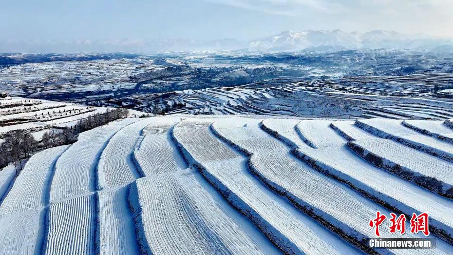 高原春日,青海省海東市互助土族自治縣東山鄉,一場春雪過后,山巒、梯田在航拍鏡頭下宛若“大地指紋”。圖為山巒、田地被白雪覆蓋。