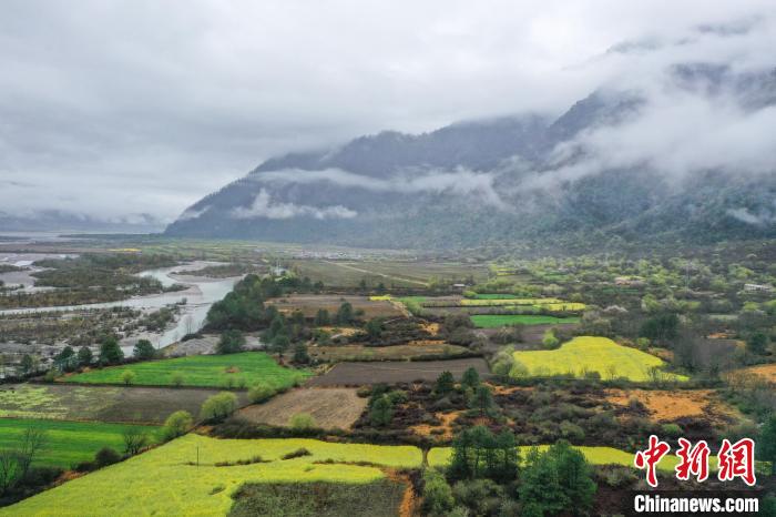 4月4日,西藏林芝市波密縣易貢鄉在雨后迎來絕美景致。云霧繚繞在群山之間,金黃的油菜花與森林、易貢湖、藏式民居、碧綠的青稞田相互映襯,宛如仙境。中新社記者 貢嘎來松 攝