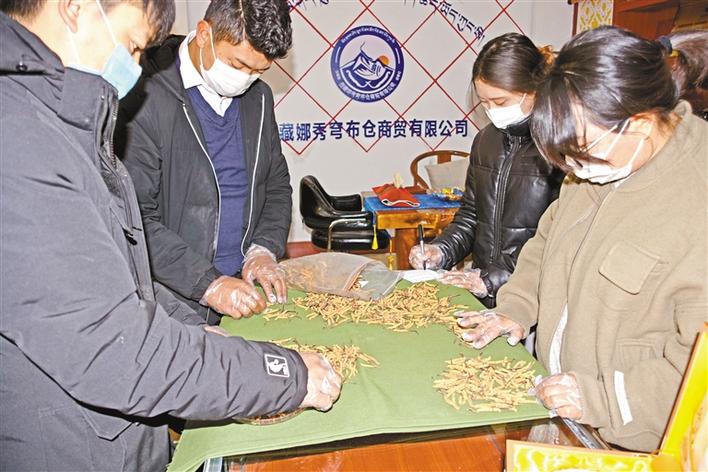 穹布倉大學生創業者正在包裝藏藥蟲草茶。