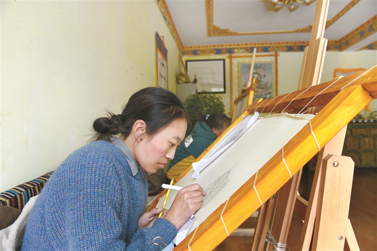據(jù)了解,西藏雪堆白傳統(tǒng)手工藝術學校的學生中,有不少是貧困農牧民子女或殘疾人士等。畢業(yè)的學生或留校任教,或獨立創(chuàng)作,靠雙手脫貧增收致富。