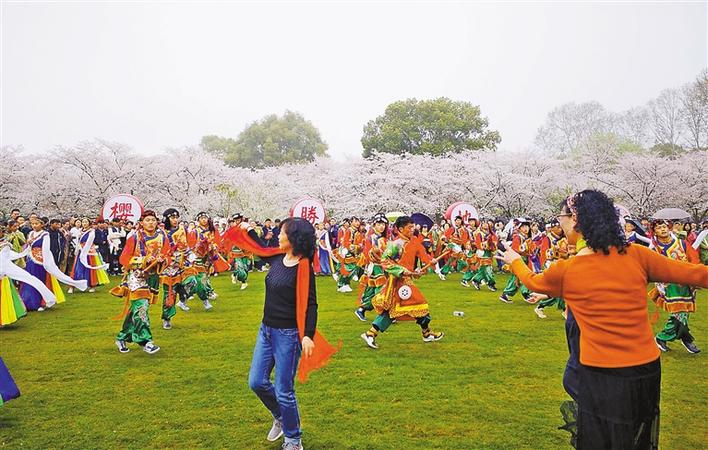 圖為在武漢西藏中學舉行的東湖櫻園綠色行活動中,各族師生翩翩起舞。西藏日報記者 索朗瓊珠 次仁片多 攝