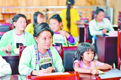 9月12日,在桂黔交界的大苗山深處,代時英和女兒在烏英苗寨“雙語雙向”培訓班聽課。新華社發