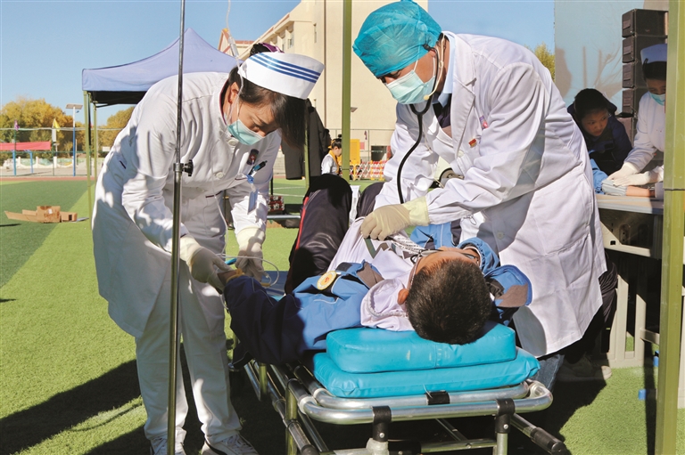 圖為在演練現場,醫生正在對“中毒”學生進行診療、救治。 拉薩融媒記者 龍俊霖攝