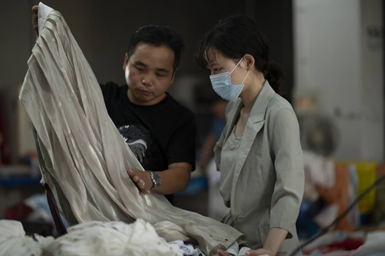 圖為劉童童(右)在漢服工廠內研究漢服布料設計、制作細節。受訪者供圖