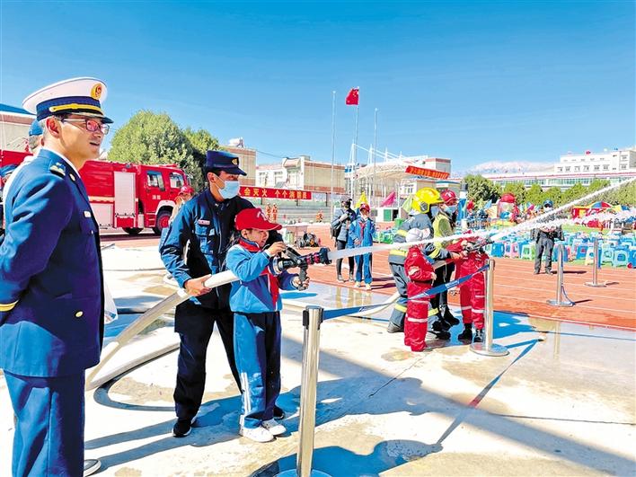 圖為山南市消防救援支隊工作人員引導小朋友們體驗消防器材的使用。郎永庫 攝