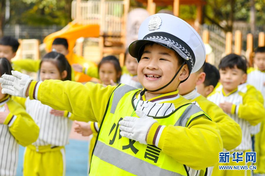 11月30日,浙江省湖州市長興縣龍山幼兒園的孩子們在學習交通指揮手勢。在12月2日“全國交通安全日”即將到來之際,各地舉行了形式多樣的教育活動,讓孩子們在趣味活動中樹立交通安全法治意識,養成文明出行好習慣。新華社發(譚云俸 攝)