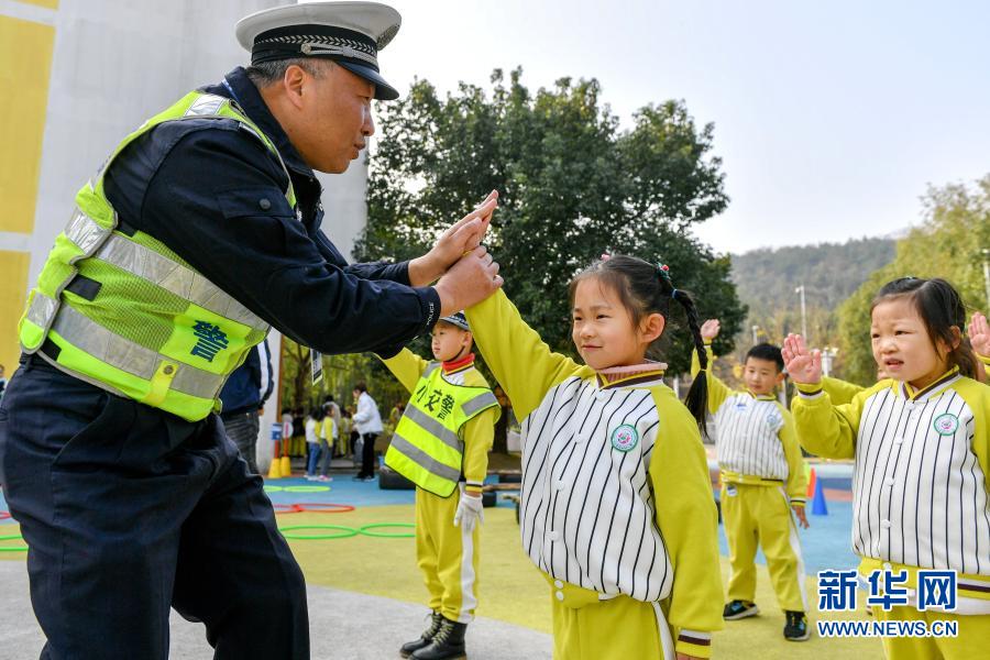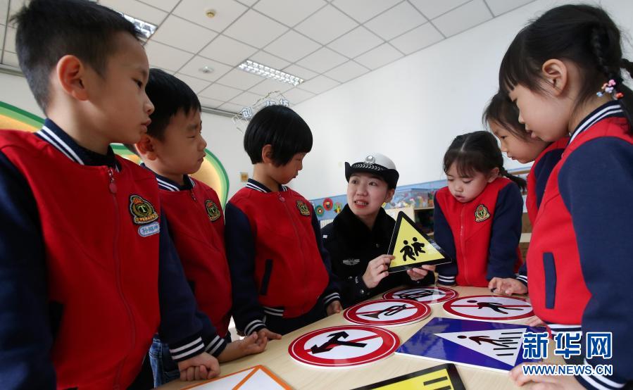 11月30日,交警在位于濟南市的山東省實驗幼兒園南校區指導孩子們識別交通安全標識牌。新華社發(郝群英 攝)