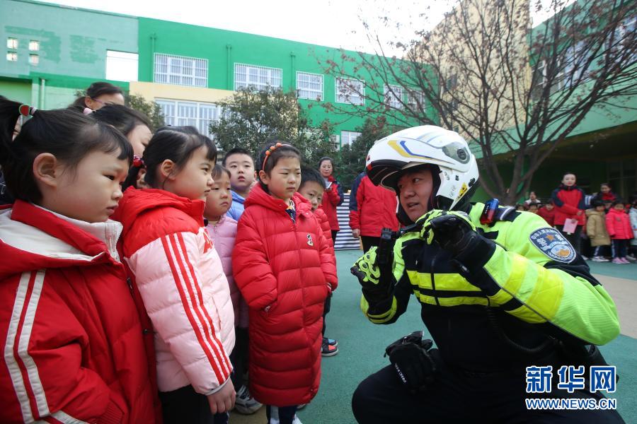 11月30日,在位于濟南市的山東省實驗幼兒園南校區,交警向孩子們展示執法記錄儀。新華社發(郝群英 攝)