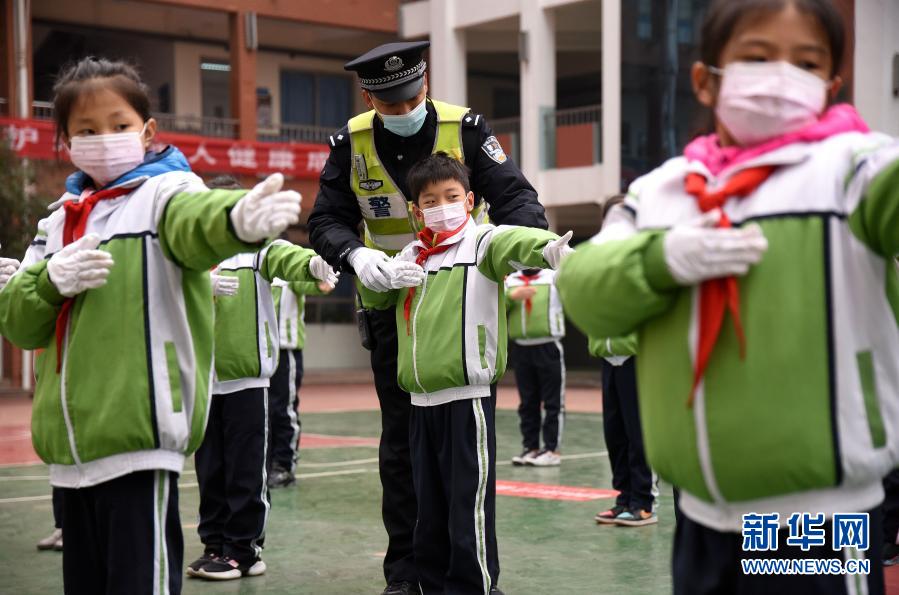 11月30日,河北省邯鄲市公安局交巡警支隊叢臺一大隊的民警在指導叢臺小學的學生們學習交通指揮手勢。新華社發(郝群英 攝)