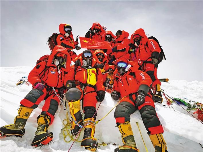 5月27日,2020珠峰高程測量登山隊成功登頂世界第一高峰珠穆朗瑪峰。他們在峰頂豎立覘標,安裝GNSS天線,開展各項峰頂測量工作。45年前的這一天,中國人首次將覘標帶至珠峰峰頂。新華社特約記者 扎西次仁 攝