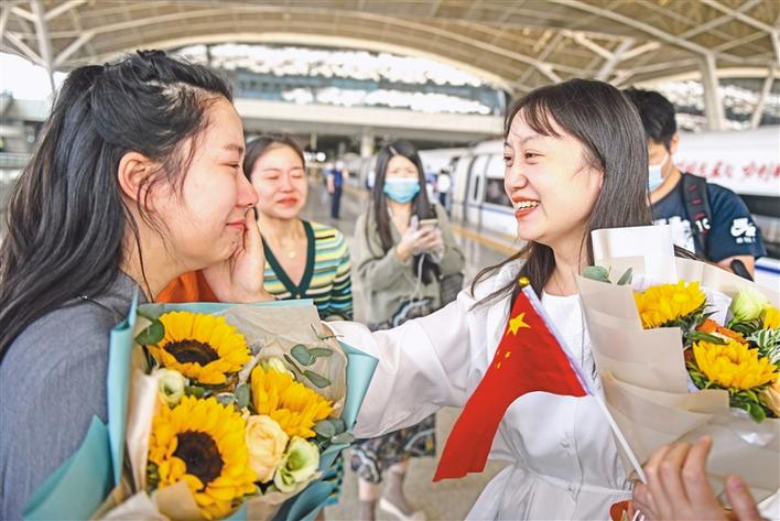 10月1日,一批馳援過武漢抗疫的江蘇醫療隊隊員重回武漢,曾經并肩戰斗的江蘇援鄂醫療隊員吳衛娟(右)和武漢市江夏中醫院的董璇(左)再度相逢,喜極而泣。新華社記者 程敏 攝