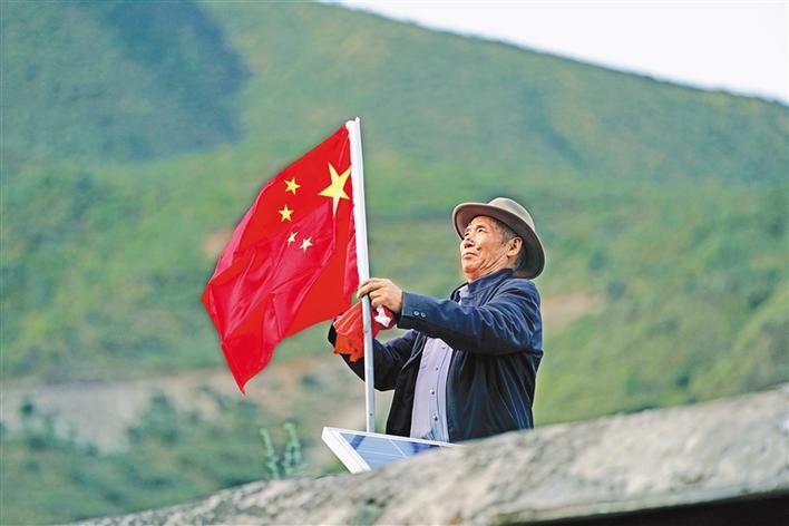 9月25日,在西藏昌都市江達縣崗托村,普巴在屋頂上換上嶄新的國旗,這是他每月進行一次的“儀式”。今年是昌都解放70周年,普巴說,現在我們的美好日子,是解放軍用生命和鮮血換來的,這份恩情,我們不會忘記。新華社記者 詹彥 攝