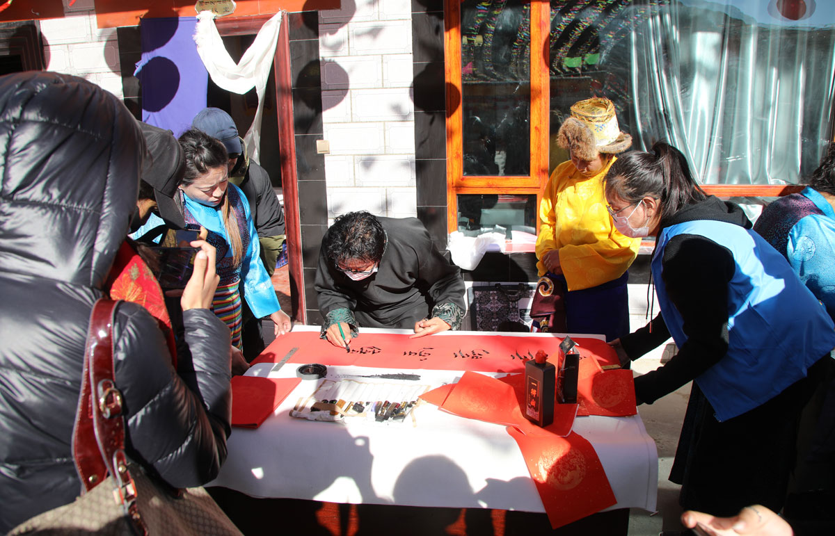 西藏自治區書協副主席、拉薩市書協副主席南杰旺扎說:“值此新春佳節和藏歷新年來臨之際,拉薩市文聯書法家協會組織了三位老師來到吉蘇村開展送書法活動,一是宣傳黨的好政策,二是雙節臨近給基層干部群眾送上節日的祝福。”