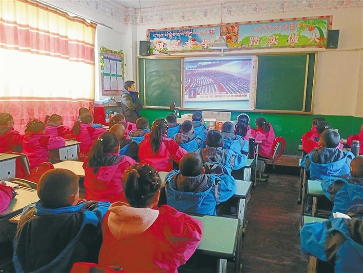 圖為昌都市洛隆縣馬利鎮第二小學師生在收看全國兩會盛況。圖片由昌都市洛隆縣馬利鎮第二小學提供