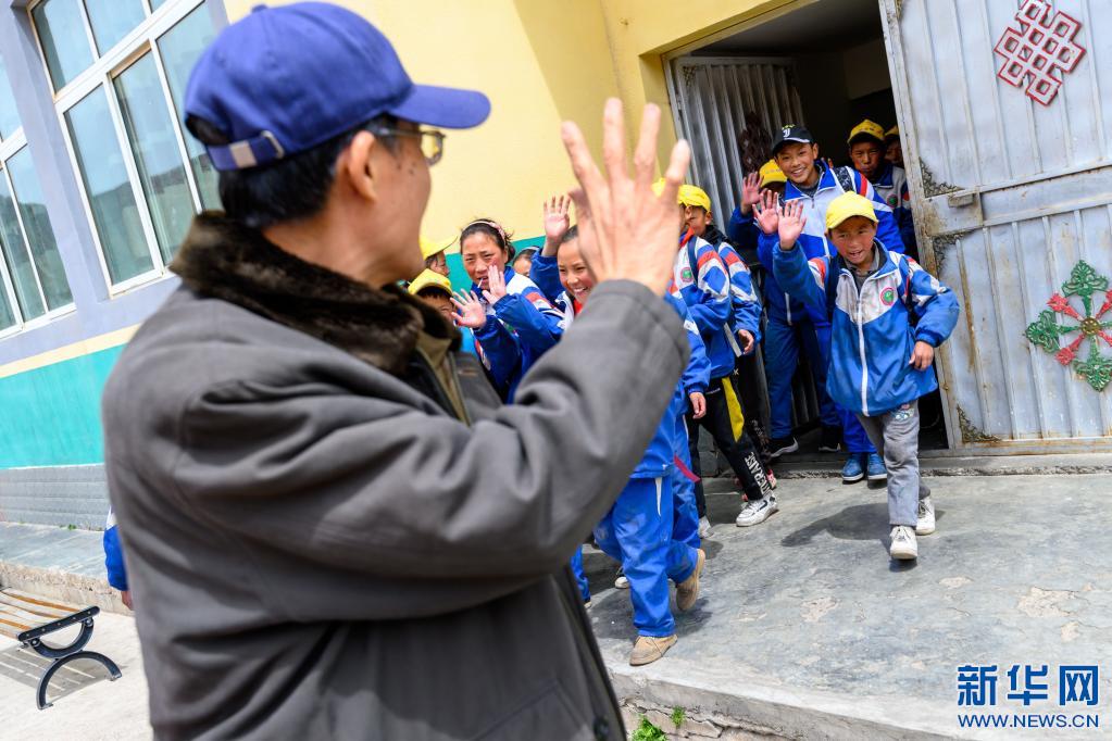 5月4日,在西藏昌都市類烏齊縣長毛嶺鄉第一小學,學生們向李純民道別。新華社記者 劉金海 攝