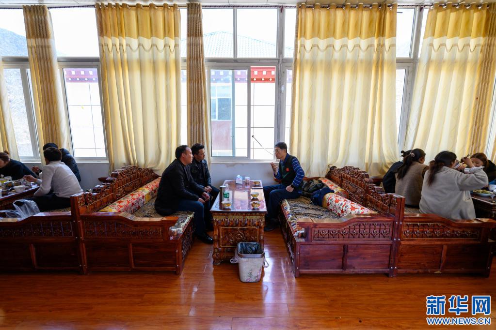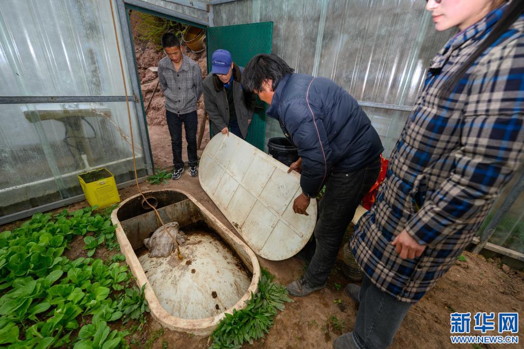 5月2日,在西藏昌都市類烏齊縣濱達鄉濱達村,李純民(左二)在當地村民向巴巴登(右二)家中查看沼氣罐的使用情況。新華社記者 劉金海 攝