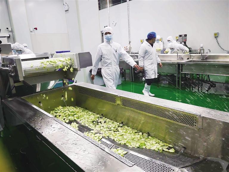 通過員工通道,在該廚房生產(chǎn)廠長甘文忠的指導(dǎo)下,記者穿上了白色工作服、戴上食品安全帽,換上高筒膠鞋,洗手消毒、測量體溫、隨身攜帶的手機、首飾全部摘掉后,通過腳踏池進入生產(chǎn)加工車間。