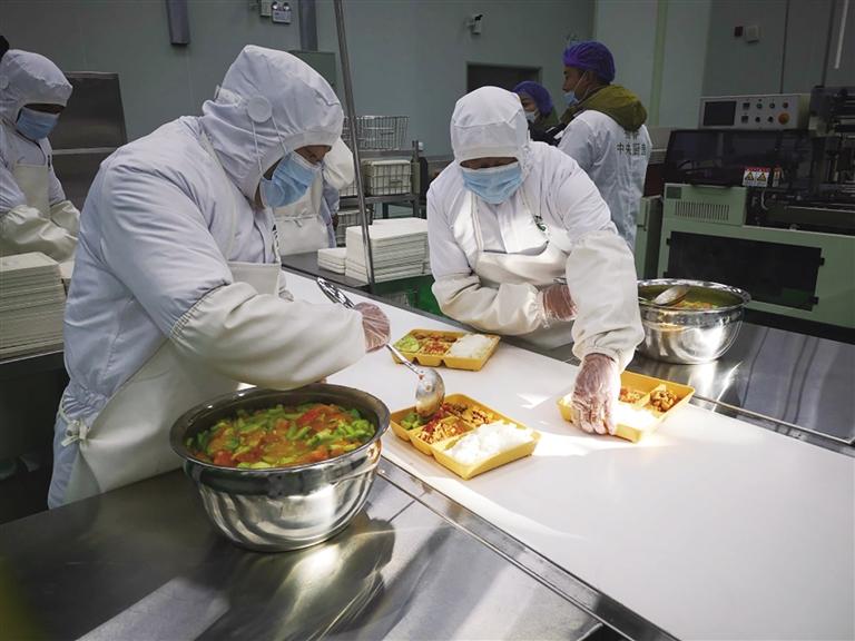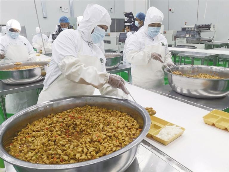 這些凈菜準備好后,通過設(shè)備轉(zhuǎn)運至熱菜烹炒車間,在這里有幾位廚師正在烹飪宮保雞丁、西紅柿炒蛋、青菜西紅柿湯等。這些凈菜經(jīng)過加工之后被運送至分餐車間。餐盒經(jīng)高溫消毒后,工作人員將每一份米飯、熱菜取樣留存,然后開始分工分餐,打包好的餐盒通過加溫消毒后,裝進保溫箱,運送至配餐車內(nèi)。