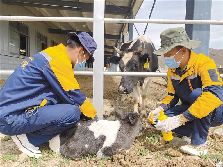 走進格桑塘現代農牧產業示范園,工作人員強久和土旦達杰嫻熟地在給小奶牛的肚臍消毒,這是他們工作3年時間順利接生的第43頭小奶牛。