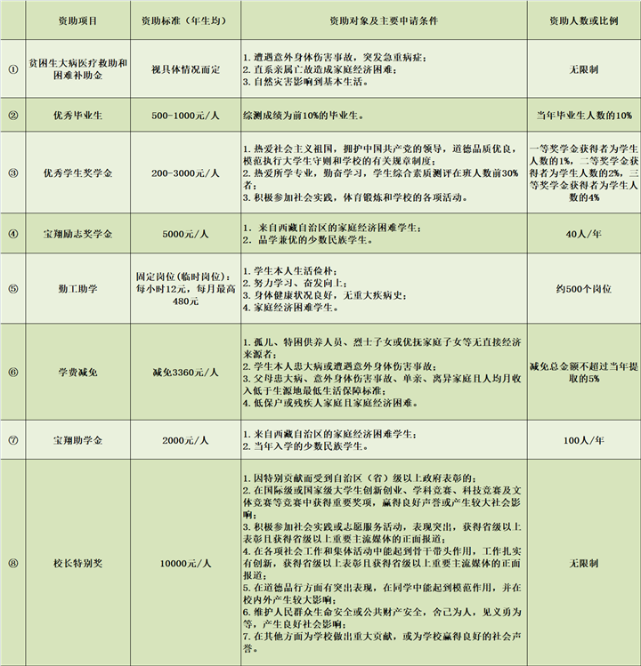 這些資助項(xiàng)目包括國家政策、西藏自治區(qū)政策和西藏各高校的政策,全部列出了明確的申請(qǐng)條件,涵蓋了學(xué)生生活、學(xué)習(xí)的方方面面。其中,有的項(xiàng)目針對(duì)家庭經(jīng)濟(jì)困難的學(xué)生給予學(xué)費(fèi)、住宿費(fèi)等的減免;有的項(xiàng)目為學(xué)生提供各種校內(nèi)勤工助學(xué)機(jī)會(huì),讓學(xué)生通過勞動(dòng)獲得報(bào)酬;有的項(xiàng)目獎(jiǎng)勵(lì)入伍,有的項(xiàng)目獎(jiǎng)勵(lì)發(fā)明創(chuàng)造……并且,西藏各高校在制定資助政策時(shí)體現(xiàn)出了各學(xué)校鮮明的辦學(xué)特點(diǎn)。例如,西藏藏醫(yī)藥大學(xué)設(shè)置了面向所有學(xué)生的“記誦《三部醫(yī)典》獎(jiǎng)”,要求“熱愛社會(huì)主義祖國,擁護(hù)中國共產(chǎn)黨的領(lǐng)導(dǎo);遵紀(jì)守法,遵守學(xué)校規(guī)章制度;背誦學(xué)生按‘三部醫(yī)典’章節(jié)順序依次背誦。在背誦過程中,要吐字清晰,聲音宏亮,總時(shí)間不能超過2個(gè)小時(shí)。”凡是達(dá)到要求的學(xué)生,獎(jiǎng)勵(lì)1800元。