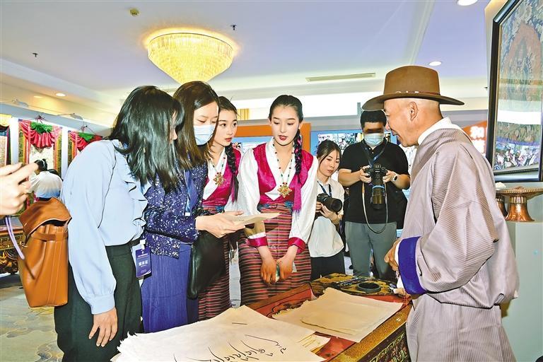 圖為在“2023·中國(guó)西藏發(fā)展論壇”上,西藏書法家向嘉賓介紹藏文書法。記者 旦增西旦 攝