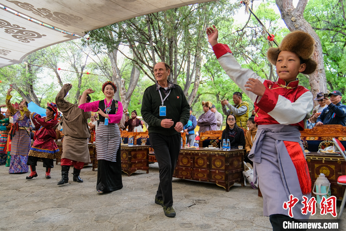 圖為5月19日,柯馬凱在拉薩羅布林卡聽藏戲,和當地藏族民眾一道跳鍋莊舞。 中新社記者 江飛波 攝