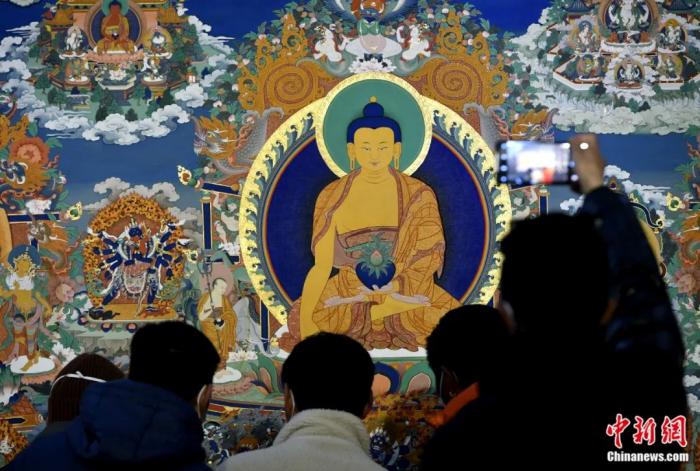 西藏拉薩,觀眾正在欣賞展覽中的唐卡。李林 攝