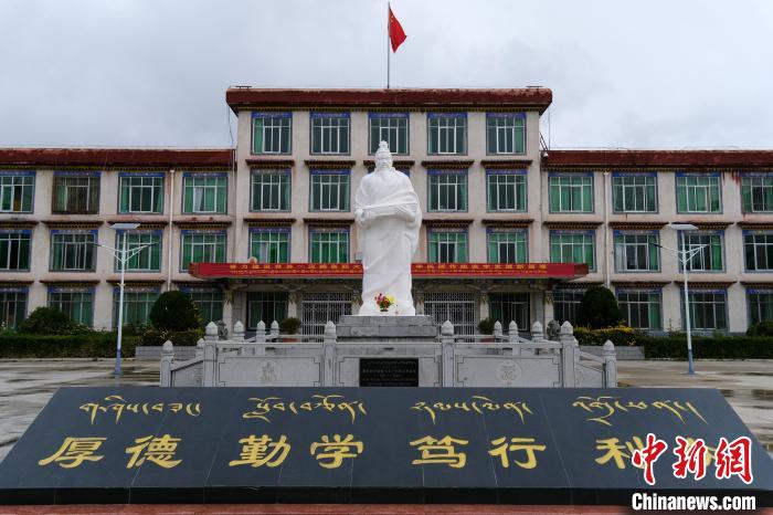 10月12日,西藏藏醫藥大學校園內矗立的藏醫藥學祖師宇妥·寧瑪云丹貢布雕像和藏漢雙語鐫刻的校訓。中新社記者 江飛波 攝