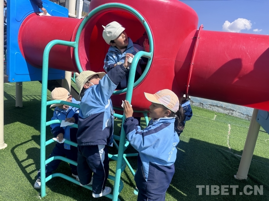 圖為拉孜縣幼兒園孩子們積極參與校園衛生大掃除