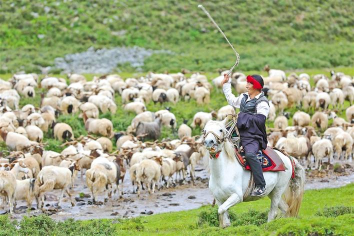 2015年以來,貢覺縣引進先進養殖技術,建立健全阿旺綿羊養殖繁育體系,實現了阿旺綿羊生產養殖規模化、產業化,帶動了農牧民脫貧增收。 圖為貢覺縣阿旺鄉多熱村村民波澤正在放牧家里的阿旺綿羊。記者 陳志強 攝