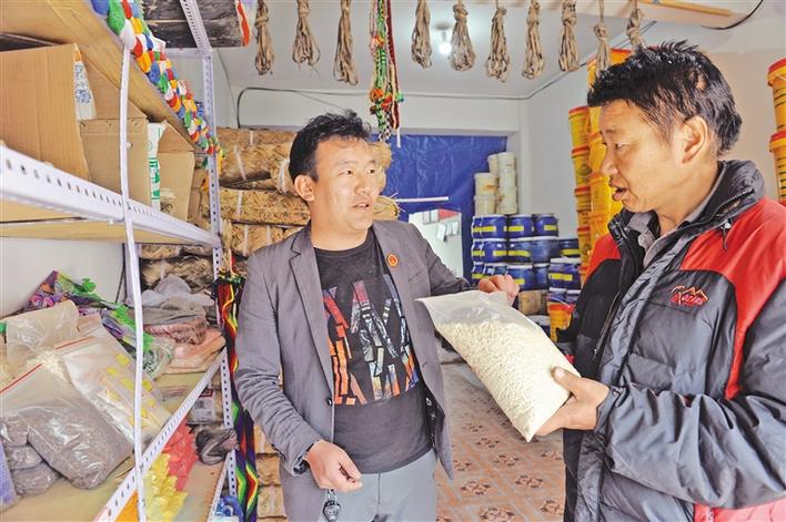 巴青縣雅安鎮產業合作社社員在給鎮黨委書記遲拉(左)介紹特色產品銷售情況。