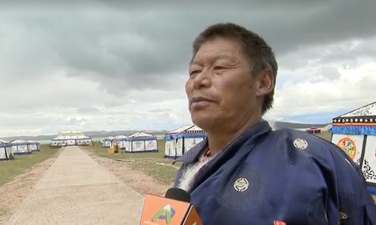 圖為羅次在“移動帳篷”前接受采訪 圖片來源那曲廣播電視臺