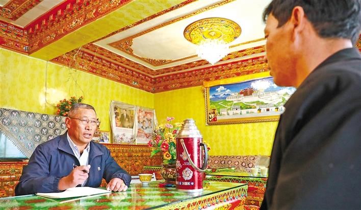 通嘎社區“四講四愛”宣講員阿瓊在了解米瑪脫貧致富的故事。記者 劉斯宇 格桑倫珠 攝