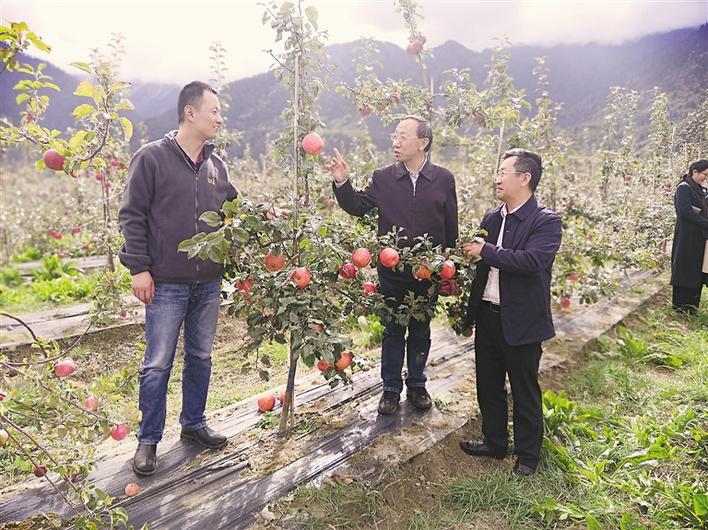 圖為國家蘋果產業技術體系首席科學家霍學喜(中)在米林縣羌納蘋果示范基地現場開展技術指導。記者 李梅英 攝