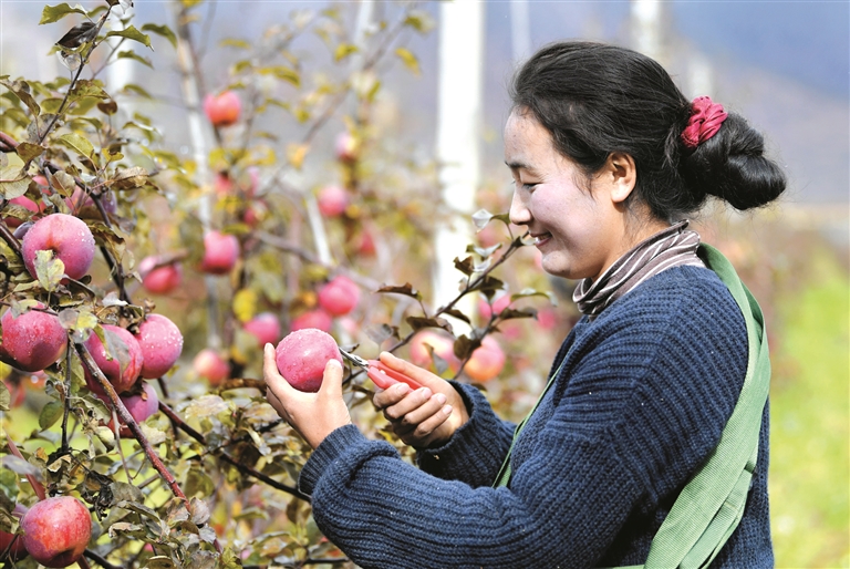 圖為在林芝市米林縣羌納鄉西藏林芝現代蘋果標準化園區,務工人員在采摘蘋果。 新華社記者 張汝鋒攝