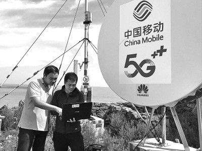 在江蘇灌云縣開山島,中國移動工作人員測試5G信號。新華社發