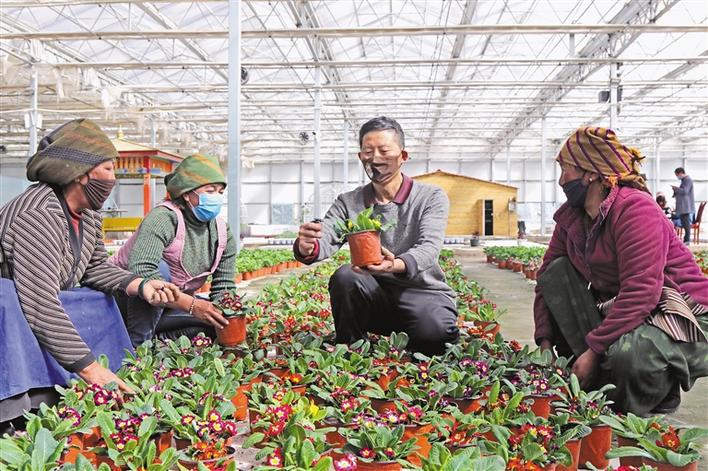 林周縣陽光溫室示范園區技術人員在指導村民種植花卉。
