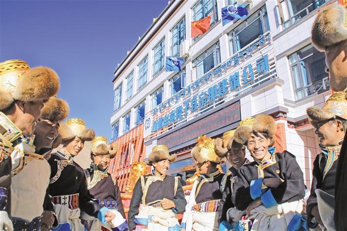 隆子縣宗那建筑公司新辦公樓前,農牧民務工人員慶祝企業喬遷。