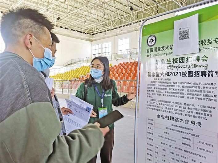 圖為西藏職業(yè)技術(shù)學(xué)院2021屆農(nóng)牧類專業(yè)畢業(yè)生校園招聘會現(xiàn)場,新希望六和股份有限公司工作人員向?qū)W生介紹招聘信息。記者 王莉 攝