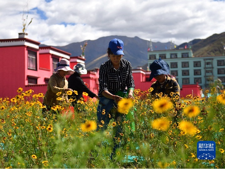 西藏拉薩市四季吉祥村村民在采摘雪菊(2017年9月27日攝)。新華社記者 晉美多吉 攝
