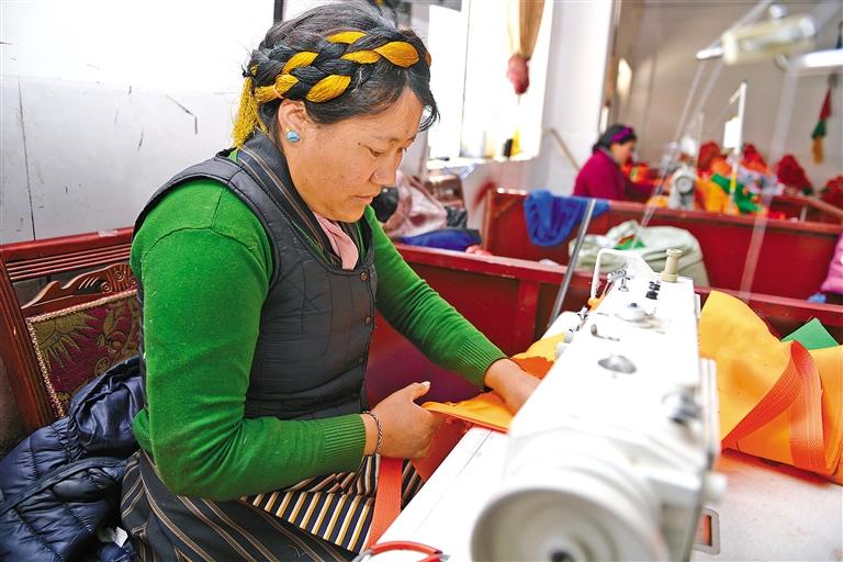 圖為拉薩市尼木縣民族雕刻紡織合作社的技師在縫制產品。記者 丹增群培 攝