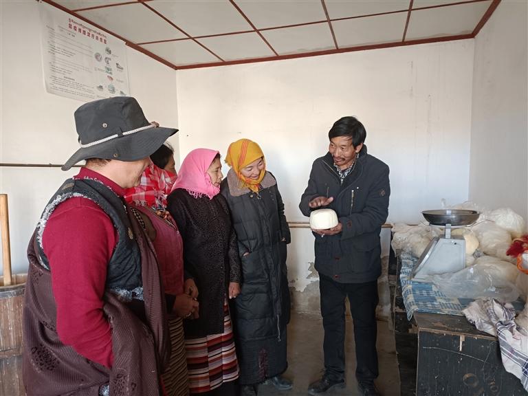 馬村草場遼闊,有著養(yǎng)殖犏牛等牲畜的良好自然條件。以前該村由于一直依靠傳統(tǒng)方式養(yǎng)牛,規(guī)模小、科技含量低、品種老化、產(chǎn)業(yè)帶動(dòng)力不明顯,一直處于“家家養(yǎng)牛家家窮”的狀態(tài)。2013年,在拉薩市委組織部(駐村工作隊(duì))的幫扶下,投入90萬元成立了堆龍德慶區(qū)馬鎮(zhèn)馬村平措犏牛養(yǎng)殖合作社。接下來的幾年不斷擴(kuò)大養(yǎng)殖規(guī)模和提高養(yǎng)殖經(jīng)營水平,建成了馬村高原特色犏牛養(yǎng)殖及乳制品加工銷售一體化養(yǎng)殖基地,其乳制品深受市場的歡迎。目前,合作社有犏牛100多頭,帶動(dòng)5人就業(yè),2019年起除了與其他村集體經(jīng)濟(jì)收入一起給常住戶分紅外,每年向本村建檔立卡貧困戶分紅。“我們村經(jīng)過發(fā)展,成立了犏牛養(yǎng)殖合作社,合作社的收入一年比一年好。今年,村集體經(jīng)濟(jì)為我們脫貧戶每戶分紅2900元,我們特別開心。今后也希望能更多地參與到村集體發(fā)展中,學(xué)好技術(shù),讓家庭條件越來越好?!贝迕衤迳8吲d地說。