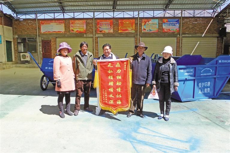 仁欽蔡村村委會向馬哈哈送錦旗。
