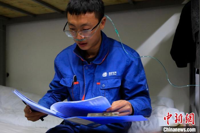 圖為付新程完成當日的檢修工作,在宿舍內一邊吸氧氣,一邊研究工作方案。 孟瑋 攝