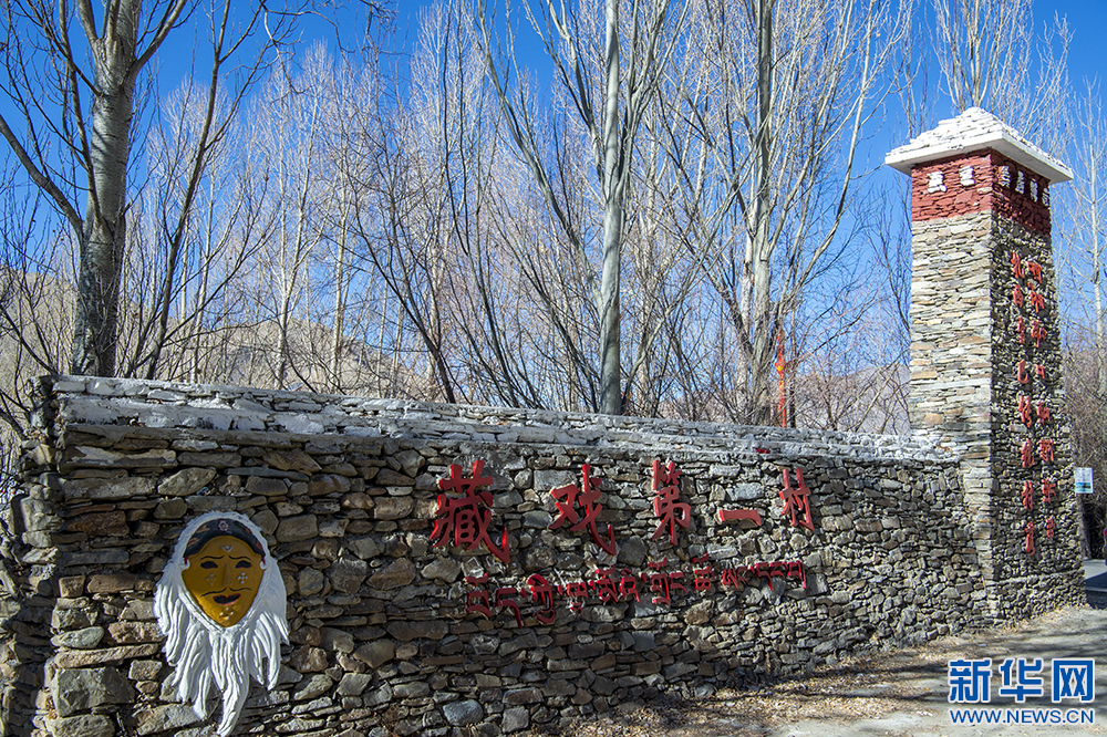 圖為扎西曲登社區大門旁的雅礱扎西雪巴藏戲面具和標語(12月9日攝)。新華網 旦增努布 攝