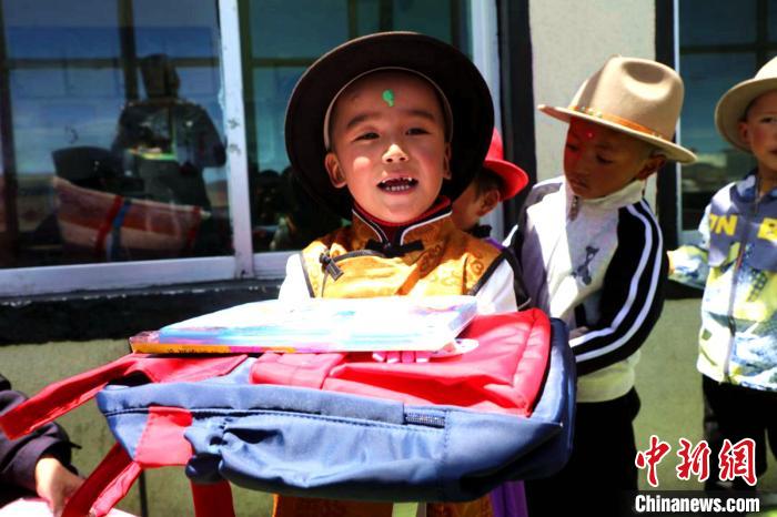 圖為普瑪江塘鄉小學生領取書包等學習用具。 浪卡子縣網信辦供圖