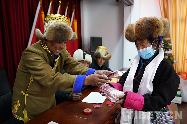 “普布達桑44565元、多吉扎西38750元、加央卓瑪2000元……”被叫到名字的村民和放牧員們紛紛上前領取入股后的第一次分紅。當天牧場為12名放牧員和入股的102戶村民共發放了64.65萬元的薪資和分紅款。