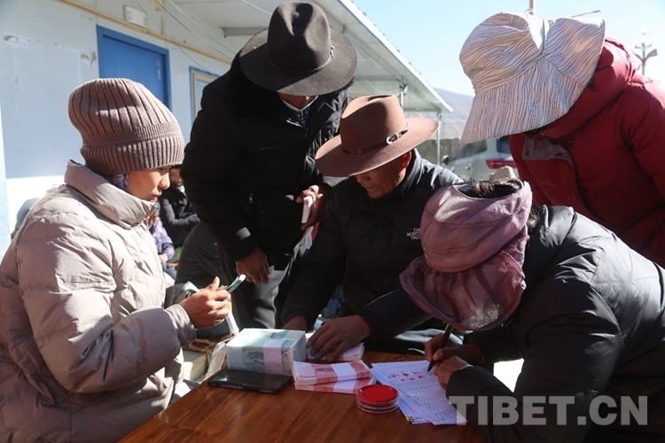 圖為工作人員正在發放分紅款 攝影:白瑪論珠