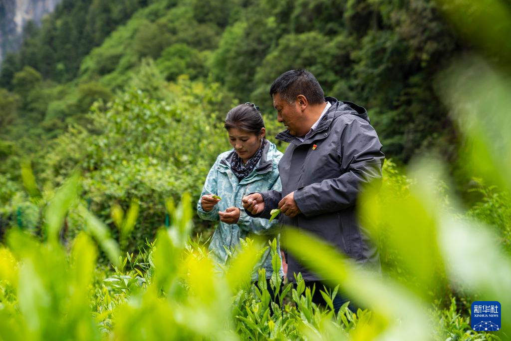 在勒門巴民族鄉的一處茶田,格桑旦增和女兒次仁旺姆正在查看茶葉生長情況(2023年6月27日攝)。新華社記者 孫非 攝